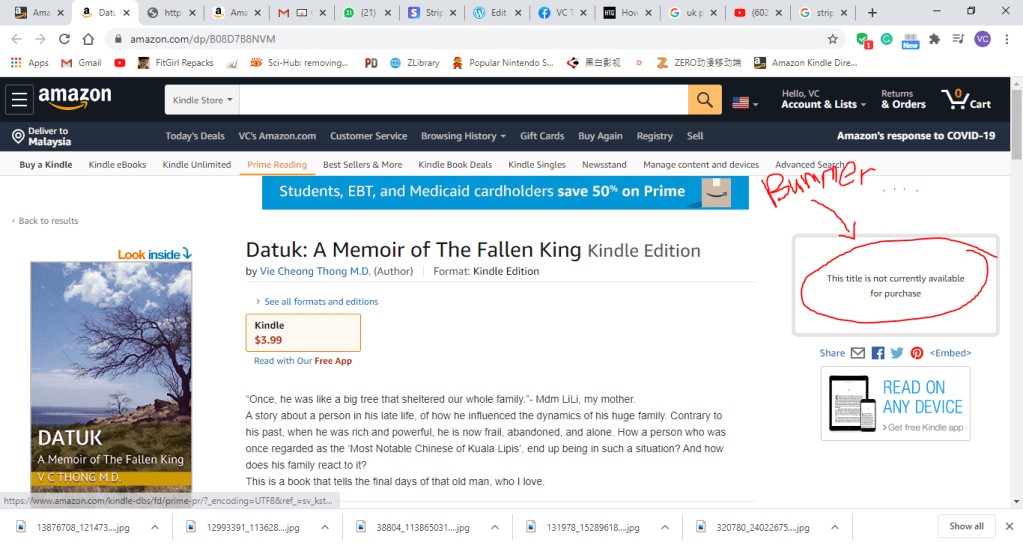 It has been a few nasty days, to try to look for alternatives other than the mighty Amazon Kindle! While bombarded with cases during my usual hectic on-call duty, I have been researching new ways to upload my books for them to reach my Malaysian friends and families. Thank you for alerting me this issue, thank you for your interest in reading my book.