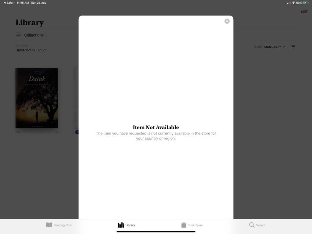 Same as Amazon, Apple Books, for my upload, is not available in my beloved Malaysia. The lists of countries they gave when I upload the book, although quite extensive, does not include my country of residence- Malaysia. That sinks my spirit down.